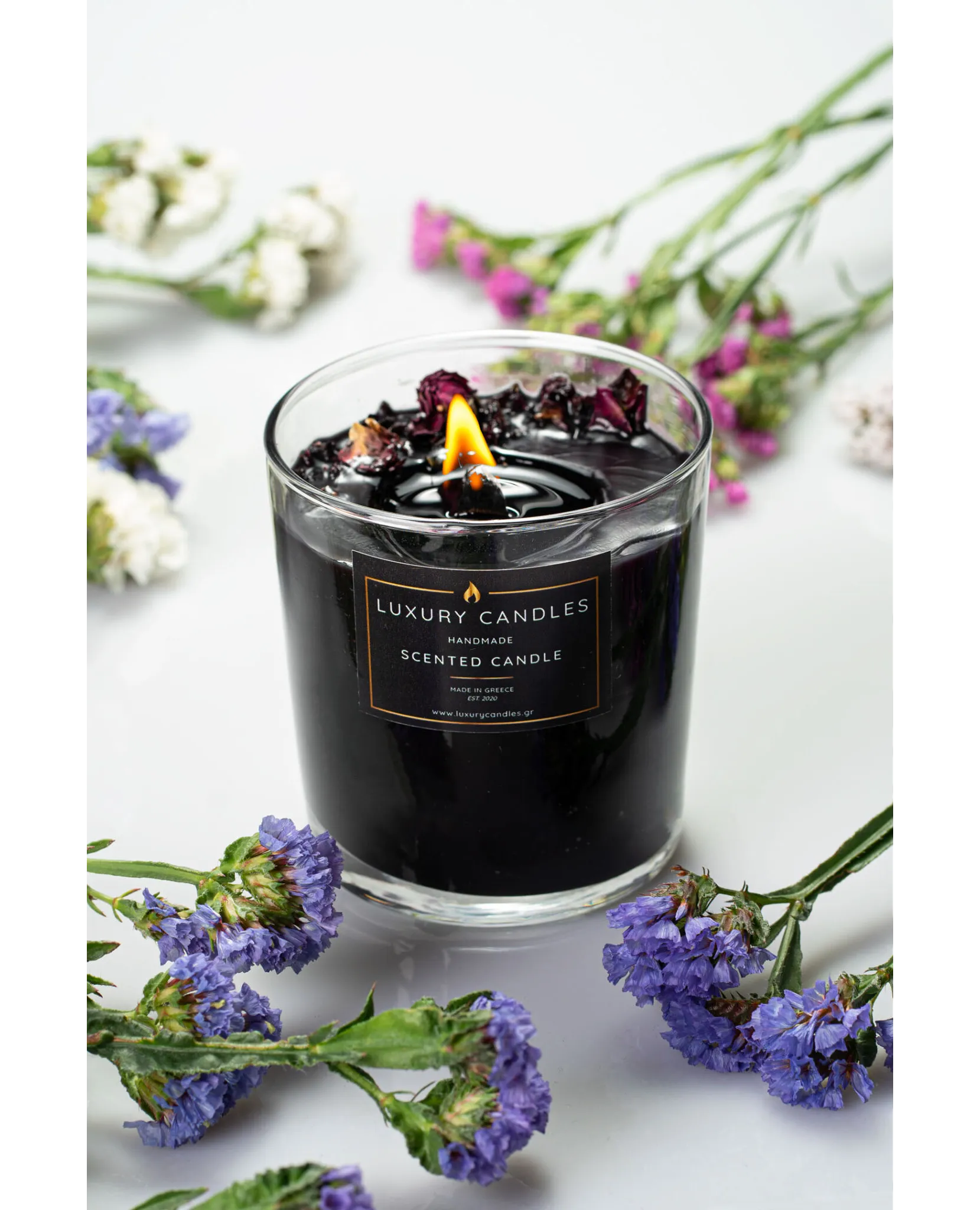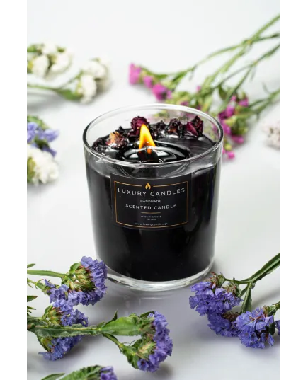 Aρωματικό Κερί σε γυάλινο δοχείο με διακόσμηση από αποξηραμένα λουλούδια : Black Orchid – Μαύρη Ορχιδέα